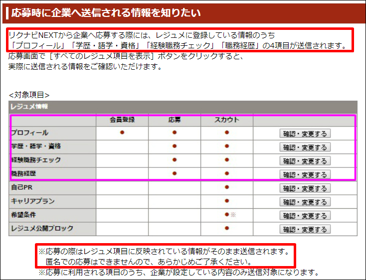 リクナビNEXTから企業へ応募する際には、レジュメに登録している情報のうち