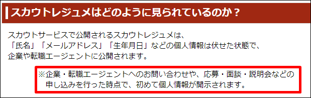 レジュメは匿名で公開されていますが、先ほどご紹介したように、企業にコンタクト(応募、返信、問い合わせなど)をすると、個人情報が相手先の企業に通知されてしまいます。