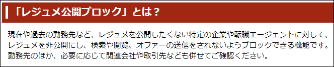 「レジュメ公開ブロック設定」をすることで、特定の企業(以前・現在の勤務先、関連会社、取引先などあなたがブロックしたい会社)に対して、あなたのレジュメを非公開にできます。